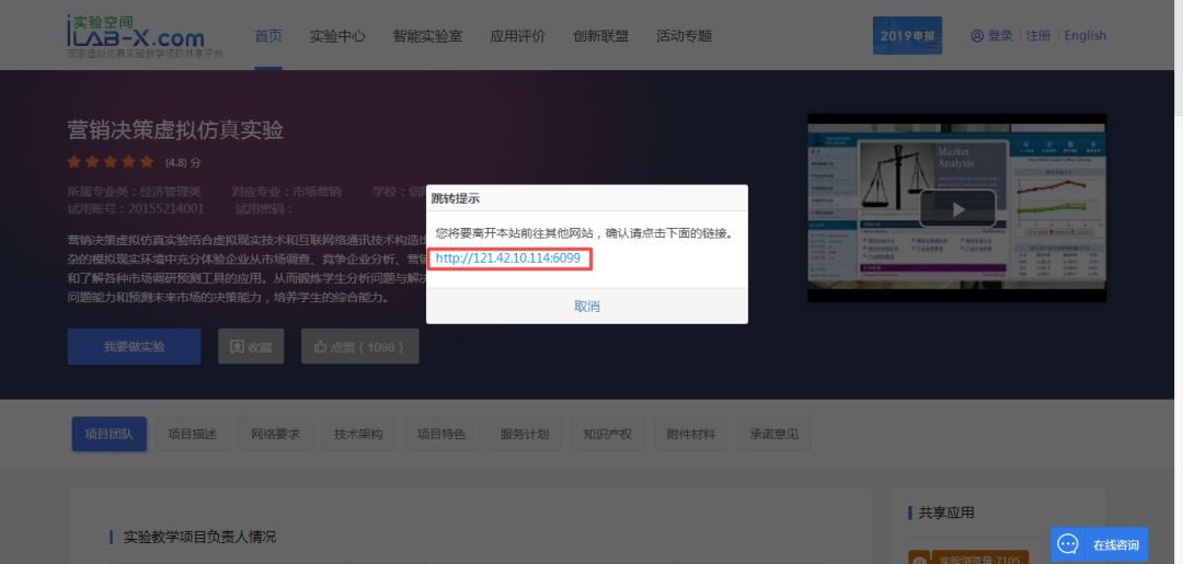 10、点击【我要做实验】,会出现一个跳转网址,点击网址进入此项目,根据此项目的说明进行实验操作。(此处开始最好使用谷歌浏览器进行实验)