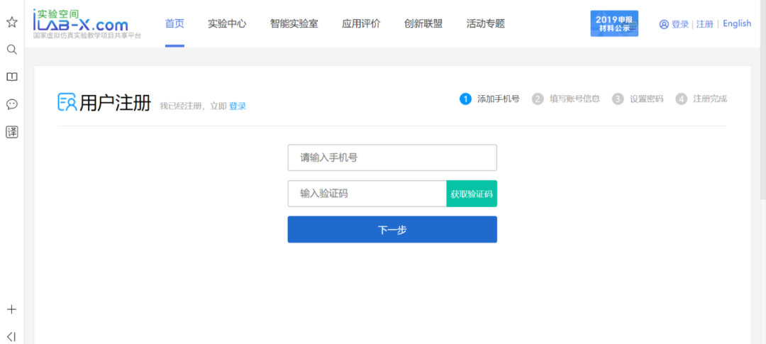 3、注册第一步:添加手机号。在对应的地方输入手机号然后点击【获取验证码】,把手机收到的验证码输入到验证码区域,确认准确无误后,点击【下一步】。